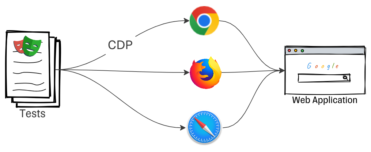 Из недостатков нового решения стоит отметить более медленный старт пода с браузером, но проблема нивелировалась добавлением возможности переиспользования уже запущенных подов браузеров в рамках тестовой сессии. Революция вторая: Playwright. Вроде на этом можно было бы выдохнуть и заняться другими делами. Но тут на сцену врывается новый тестовый фреймворк Playwright, и он получает просто взрывной адопшен. Отставив в сторону удобство написания тестов (а там все очень хорошо), Playwright предлагает более технологичный метод взаимодействия с браузером: вместо промежуточного драйвера фреймворк использует родной протокол общения. Например, для Chrome это CDP. Схема взаимодействия тестов с браузером максимально упрощается, и это объективно сильно ускоряет тесты.