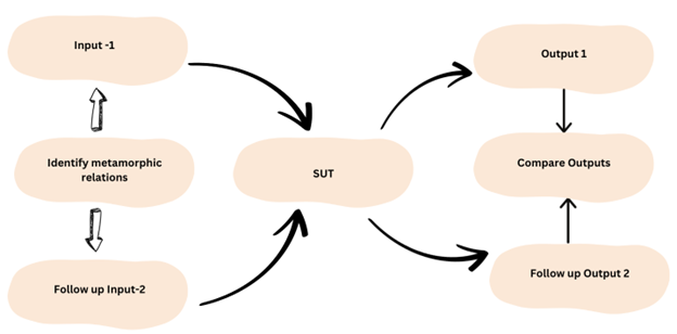 На изображении ниже представлен процесс метаморфного тестирования для системы, находящейся под тестированием (SUT).