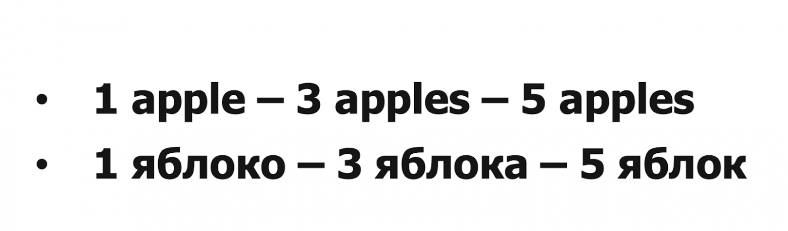 А вот для некоторых языков, например, романской группы форма множественного числа одна. В некоторых языках есть общие для них особенности, где форма глагола или прилагательного может очень сильно отличаться от числа, от рода, от существительного и так далее. Пунктуация — крайне важный момент. Например, во французском языке есть особые правила по проставлению пробелов перед вопросительными и восклицательными знаками. В японском языке, например, могут использоваться общепринятые для нас или для англоязычных людей знаки препинания, но в то же время вот эти уголки, это, собственно, кавычки, которые там используются, причем они есть двух разных видов.