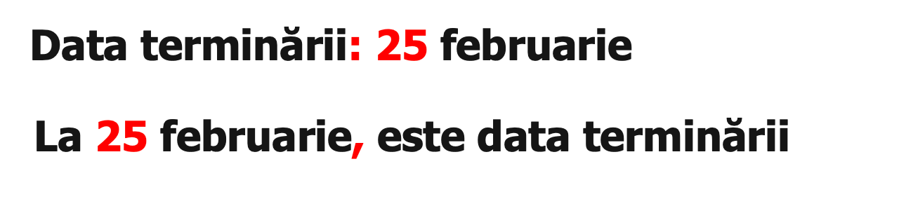 И в зависимости от того, где эти кавычки стоят, ставятся нужные. В том же испанском языке перед началом вопросительных и восклицательных предложений, соответственно, ставят перевернутые, скажем так, вопросительные и восклицательные знаки. Это нужно отслеживать. Более того, расставление знаков препинания может отличаться в зависимости от порядка слов в приложении, от порядков слов в разных языках. Например, в румынском, если у вас сначала идет главное слово и потом число, вот как тут на примере (, это в переводе дата окончания 25 февраля), ставится двоеточие. В другом же примере — будет стоять запятая.