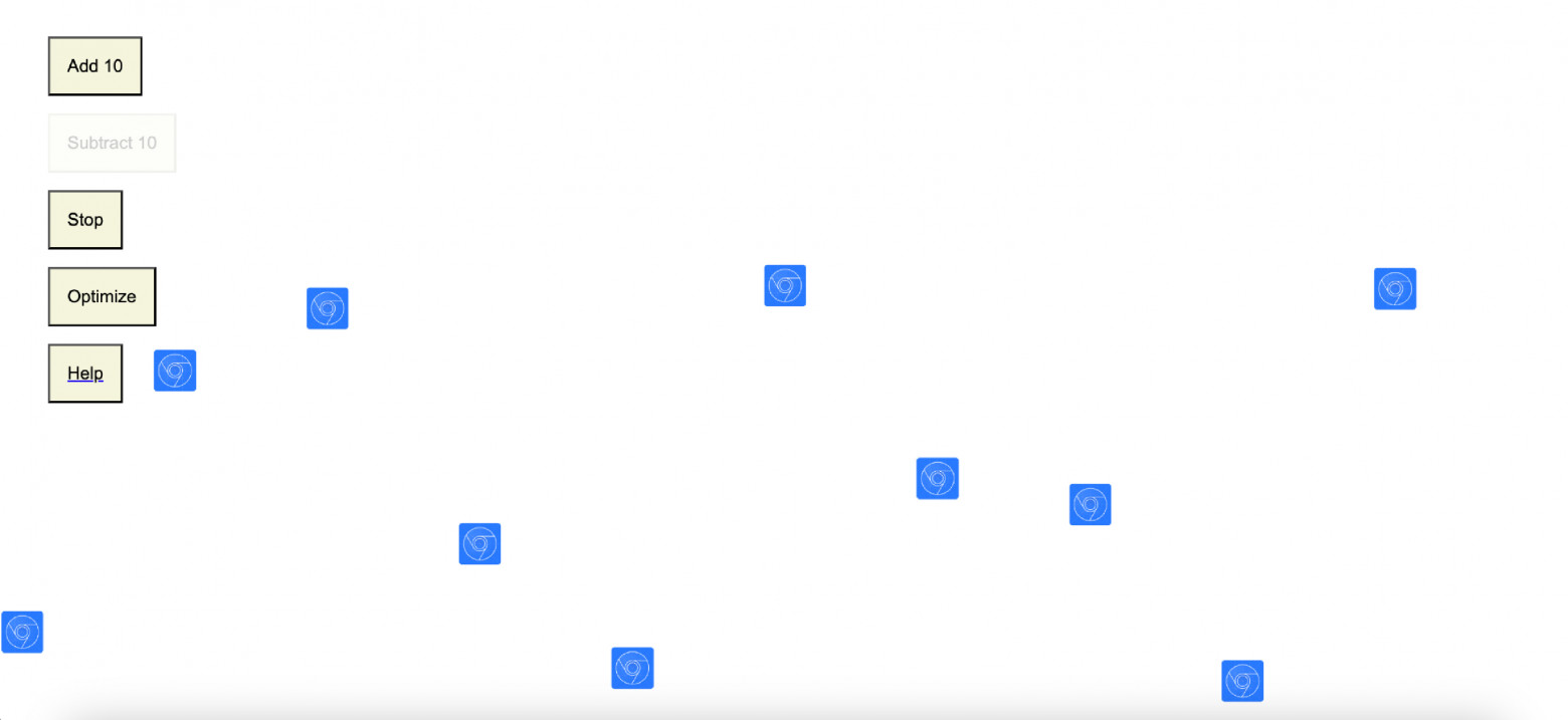 Для полноценной демонстрации возможностей инструмента необходимо подать нагрузку. Для этого я проведу демонстрацию на сайте, уже известном вам по предыдущей статье. Кратенько напомню, что он из себя представляет. Это анимация с летающими вверх‑вниз кубиками. Изначально там 10 квадратов. Интерфейс включает в себя кнопки управления, с помощью которых можно: