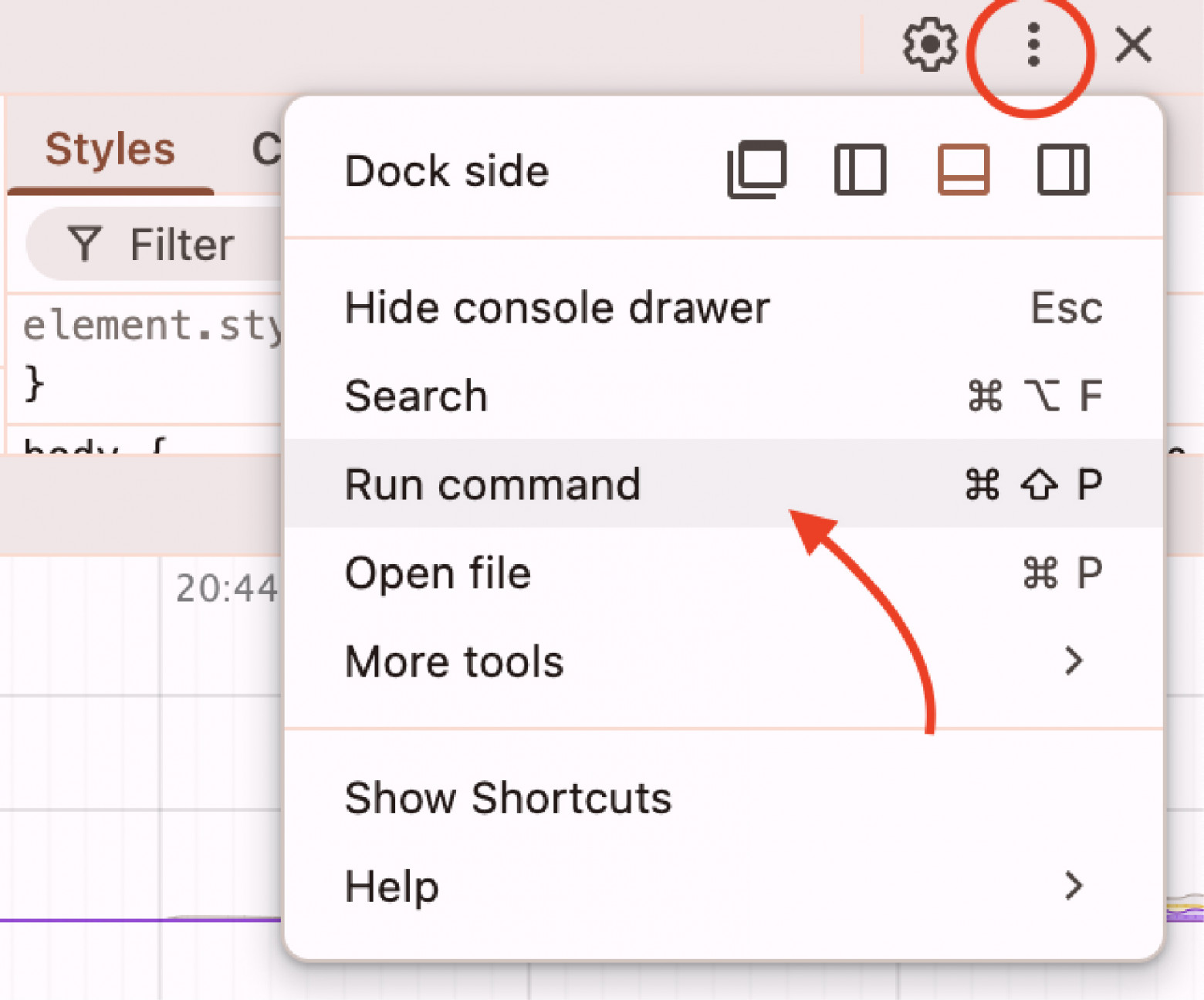 До красной линии я планомерно повышал нагрузку на интерфейс, добавляя летающие квадраты. Примерно на 110 летающих квадратах нагрузка на процессор достигла 100 %, и тогда появились ощутимые просадки производительности. После синей линии я стал убирать квадраты, и производительность резко улучшилась. Frames per second meterОценить FPS (Frames Per Second — кадры в секунду) на глаз сложно. В этом нам поможет ещё один полезный маленький инструмент DevTools под названием FPS meter. Это панель, которая висит поверх окон браузера и отображает текущий FPS. Чтобы добавить её, откроем DevTools, зайдём в расширенные возможности через три вертикальные точки и выберем опцию Run command. К слову, здесь же активируется возможность подмены трафика в DevTools, о которой я писал в своей статье.