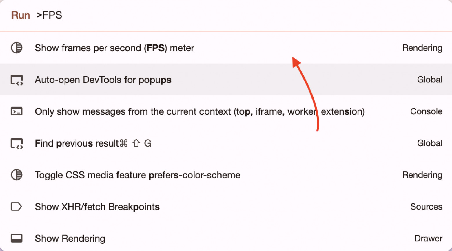 В поисковой строке наберём слово FPS и выберем команду Show frames per second (FPS) meter.