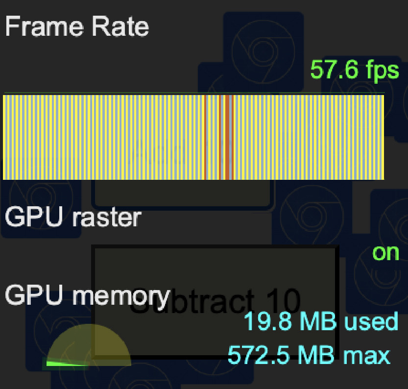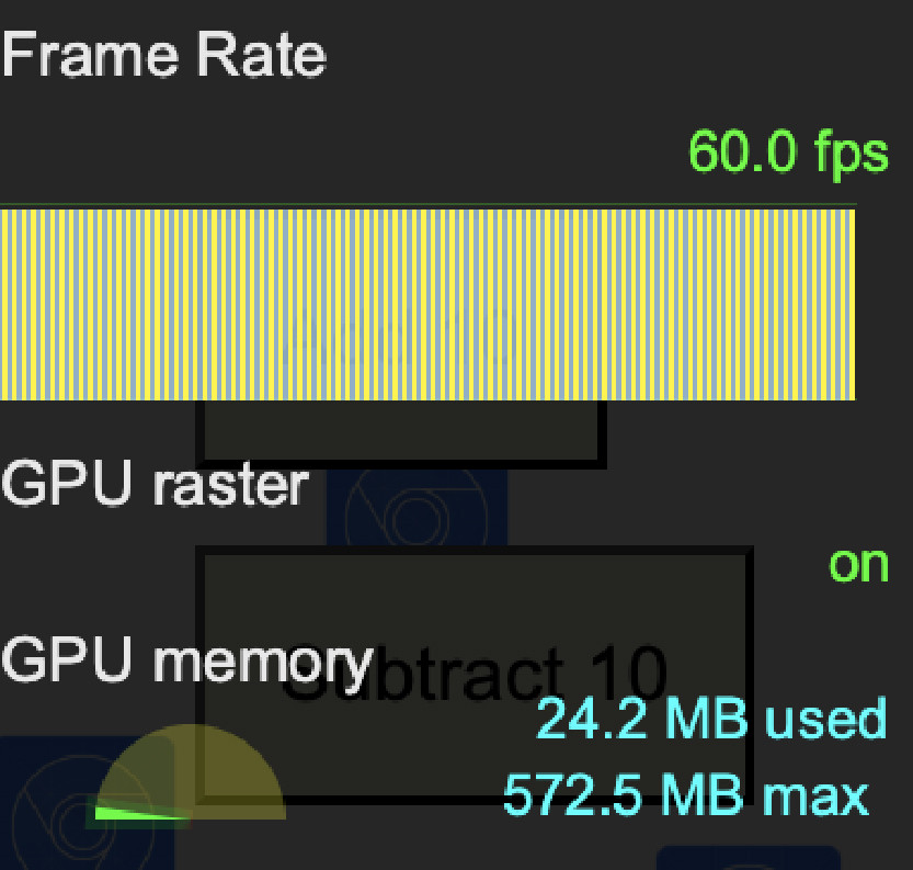 GPU memoryТут всё просто — метрика отображает текущее и максимальное потребление ресурсов графического процессора. Если текущее приближается к максимальному, то, вероятно, сайт недостаточно оптимизирован, либо у вас слабый видеочип. Вернёмся к основной метрике — Frame Rate. На моём демонстрационном сайте всего при 10 летающих квадратах он показывает 60 кадров в секунду, это комфортная глазу скорость отрисовки страницы. Как мы убедились раньше, проблемы с нагрузкой начинаются на 110 летающих квадратах. Воспроизведём эту ситуацию и посмотрим, как сильно перегруженный процессор повлиял на Frame Rate.