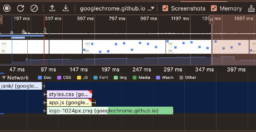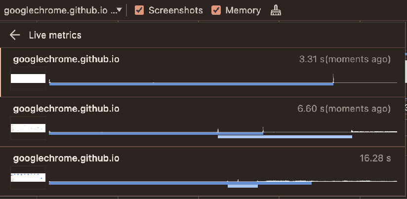 Всего Performance предлагает три варианта создания профиля нагрузки: по кнопке Record, по кнопке Record and reload и по кнопке Load profile (например, от коллеги QA). Вариант с кнопкой Record подходит, когда вам хочется измерить известный сквозной сценарий нагрузочным профилем, скажем, при загрузке на сайт видео.