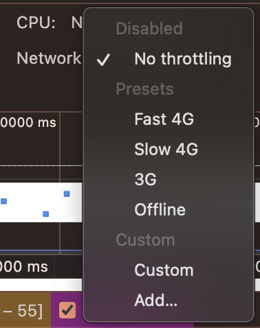 Выпадающий список профилей Network. Здесь то же самое, чем многие из вас пользовались в DevTools во вкладке Network: возможность искусственно замедлять скорость интернета. Присутствуют как встроенные профили сети (Fast 4G, Slow 4G, 3G и Offline), так и ваши кастомные. Можно переиспользовать профили, уже созданные вами во вкладке Network. Или создать новый профиль по кнопке Add. Сейчас я не буду создавать новый профиль, это тема для отдельной статьи. Мы в команде часто пользуемся этой возможностью Chrome. При замедленном интернете все проблемы видны гораздо отчётливее. При написании плана тестирования веб-приложения надо держать в уме, что вы будете тестировать, вероятно, на быстром Wi-Fi, но гостем сайта может стать пользователь, вышедший в сеть из глухой тайги. Скорость соединения в таком случае будет напоминать далекие 2000-е, когда для входа в интернет использовали 64-килобитные модемы (многие вспомнят характерный звук его подключения). Это не говорит о том, что ваш сайт должен летать на любой, даже самой низкой скорости интернета, но он должен полностью загрузиться на любой скорости. Опцию нужно задать до старта формирования профиля нагрузки.