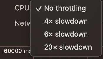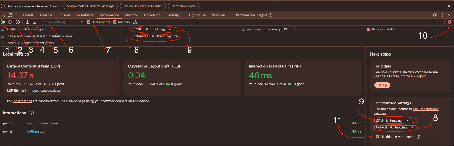 Выпадающий список профилей CPU. Если сайт быстро работает на вашем Macbook M3, то это не значит, что он будет так же быстро работать на более слабом компьютере или мобильном устройстве. Держать под рукой два компьютера (мощный и слабый) не всегда возможно. Эту проблему решает функция имитации медленного процессора. Можно имитировать четырёхкратное, шестикратное и двадцатикратное замедление от текущего показателя. Разумеется, выставлять это условие тоже необходимо до старта формирования профиля нагрузки.