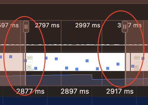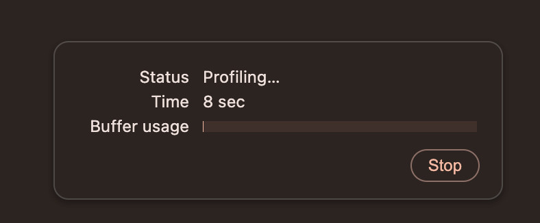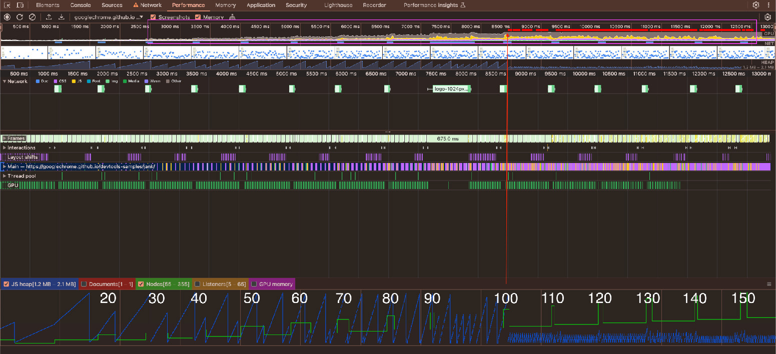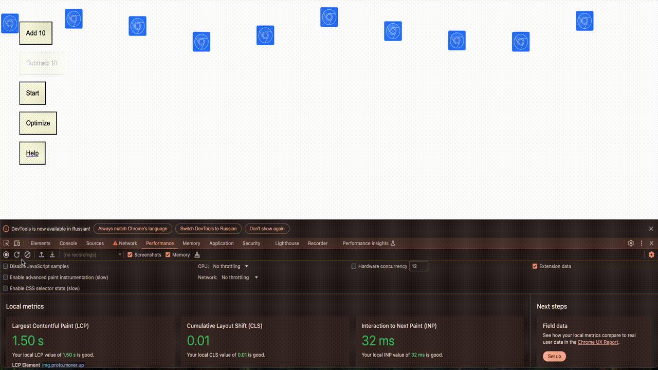 Метрика JS Heap показывает потребление ресурсов, взятых JS Heap. Бесконтрольный рост этого графика обозначает утечки памяти, на которые можно указать фронтенд-разработчику. В нашем случае потребление работает корректно. Метрика Nodes показывает загруженность DOM-дерева тегами, атрибутами, текстом — всё это на языке браузера зовется Nodes. Чрезмерное количество нод утяжеляет страницу и снижает производительность сайта. В нашем случае всё пока в пределах нормы. Что ж, пока что мы не обнаружили проблем на сайте! Попробуем ещё раз — на этот раз профиль будет создаваться по кнопке Record. После нажатия мы будем постепенно увеличивать количество летающих квадратов и определим, при каком количестве начнутся проблемы. Жмем кнопку и дожидаемся плашки с информацией о начале сбора профиля. Затем нажимаем 13 раз на кнопку сайта Add 10, с интервалом примерно в секунду, и наконец нажимаем Stop. Итоговый профиль представлен на скриншоте.