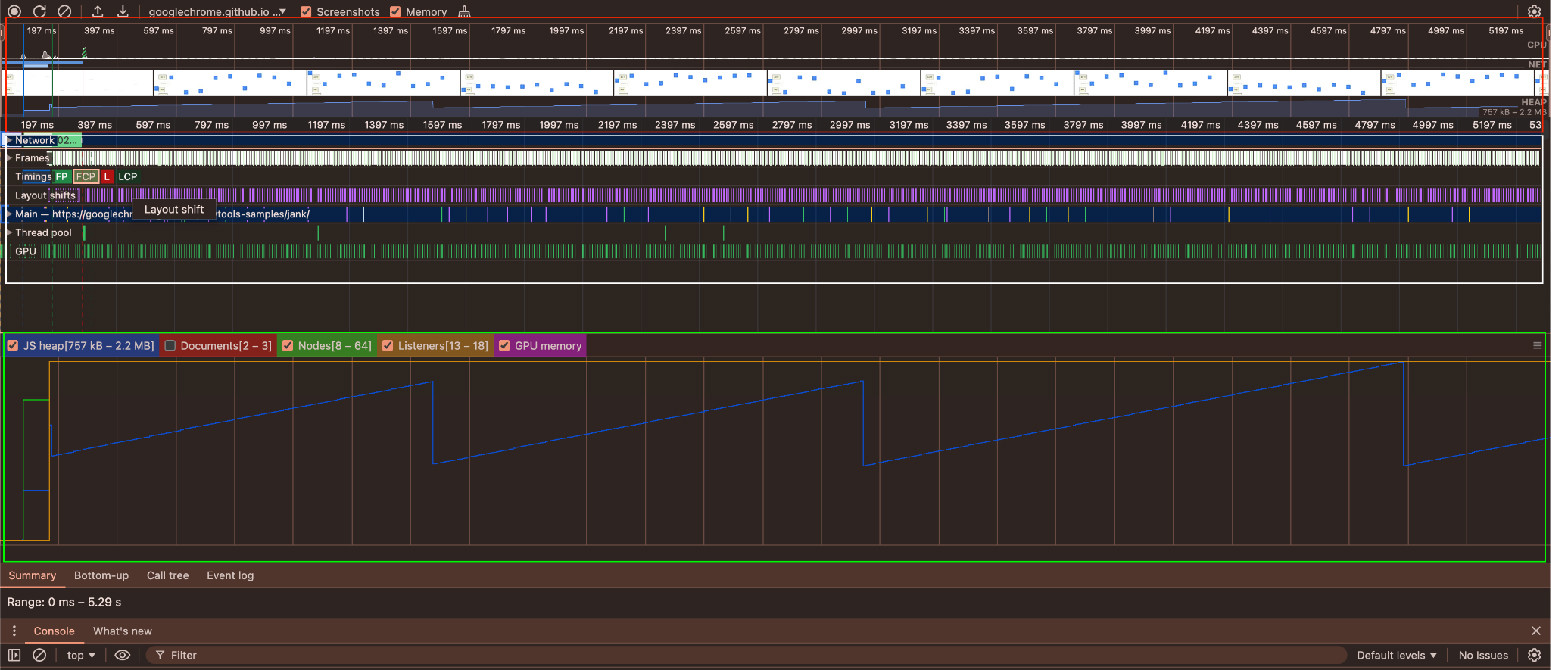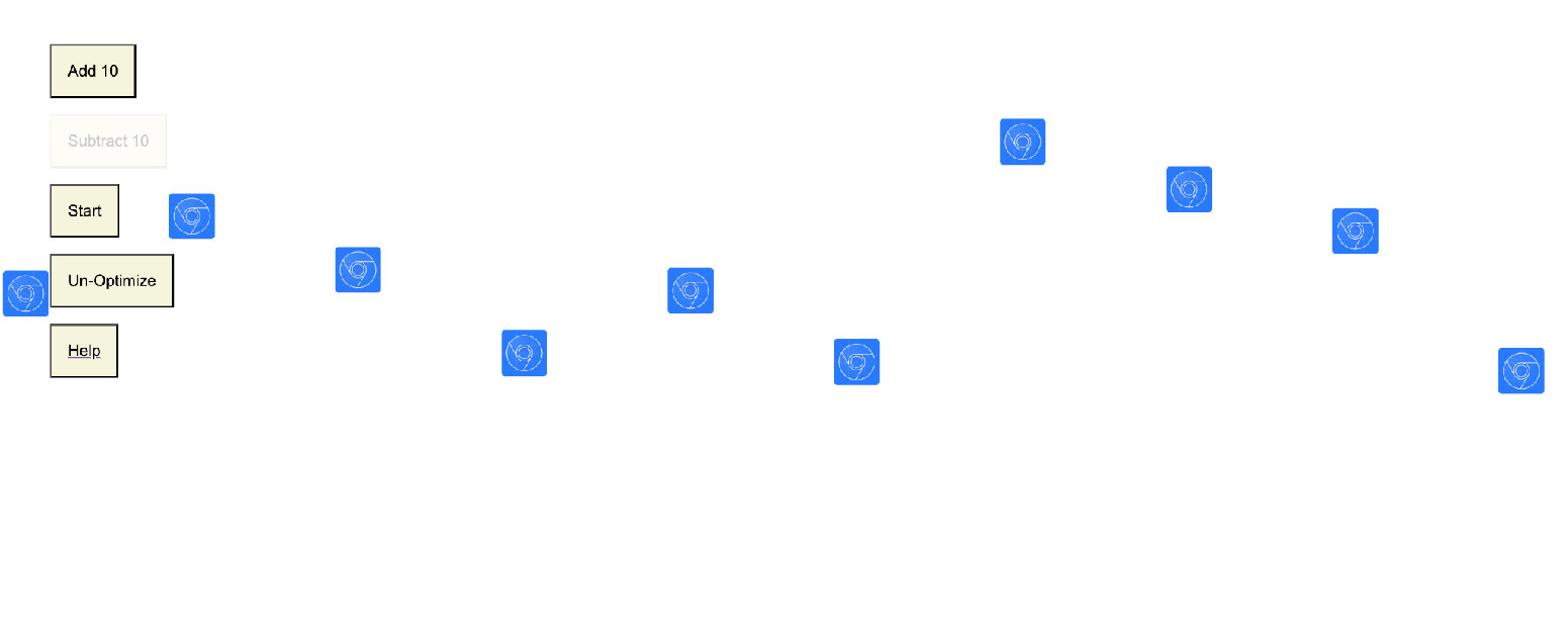 Вообще, основная функциональность этой вкладки ориентирована на разработчиков, а не на тестировщиков. Выискивать медленные frontend-модули в нагрузочном профиле — это в большей степени задача отладки кода, а не поиска дефектов. Но есть несколько моментов, полезных в тестировании производительности страницы для QA. Демонстрацию проведу вот на этом специальном демо-сайте от Google. Он представляет собой анимацию с летающими вверх-вниз квадратами. Интерфейс включает в себя кнопки управления, с помощью которых можно: