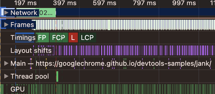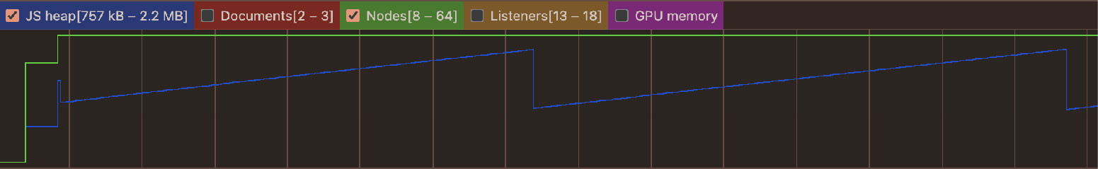 В секции Frames можно покадрово разобрать весь профиль нагрузки и оценить скорость рендеринга кадров браузером. Здесь видно, что мои кадры рендерились за 8,3 мс — отличный показатель, FPS должен быть больше или равен 60. Все секции среднего блока строятся друг относительно друга по времени и относительно верхнего блока, что очень удобно при разборе. Нижний блок профиля содержит графики метрик Frontend, меня интересуют пока только два: JS Heap и Nodes — отключим для удобства наблюдения остальные.