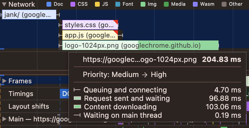 Здесь отображаются подгружаемые с сервера ресурсы: стили, JS, картинки и прочее, что видно из легенды секции. Конкретно у меня я вижу подгрузку CSS-стилей, JS-файл и логотип, который, судя по таймлайну, загружался дольше всего — примерно 200 мс. Наведём курсор на файл с логотипом.