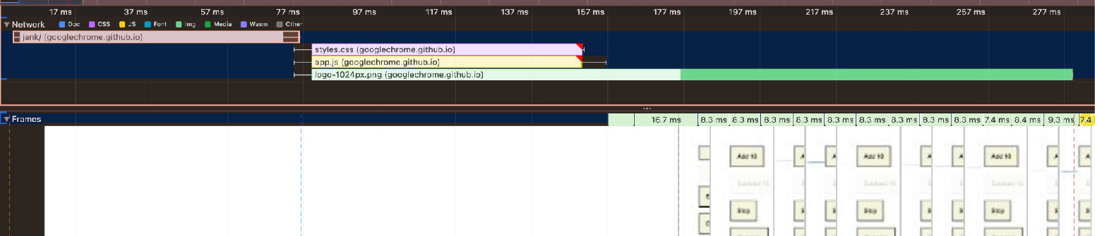 Видно, что из 200 мс примерно половину времени заняла обработка запроса, и ещё половину — непосредственно подгрузка логотипа. Пользуясь этой вкладкой, можно оценить параллельность потоков подгружаемых ресурсов и скорость их загрузки (которая напрямую зависит от размера файла), а также увидеть, из чего состояло время запроса ресурса. Увы, мне не удалось пока поймать проблемы, идём дальше. Секция FramesДля человеческого глаза комфортным считается отображение анимации с частотой не ниже 60 кадров в секунду, такой режим обеспечивает наиболее плавную картинку. Путём несложных арифметических вычислений получаем, что один кадр должен занимать не более 16 миллисекунд. На рендеринг каждого кадра Chrome тратит несколько миллисекунд. То есть один кадр должен занимать ещё меньше — до 10 миллисекунд. Чем большую нагрузку выдаёт сайт, тем дольше будут отрисовываться фреймы. В некоторых случаях это приводит к к фризам UI: изображение может зависнуть или начать отображаться рывками, как слайд-шоу.