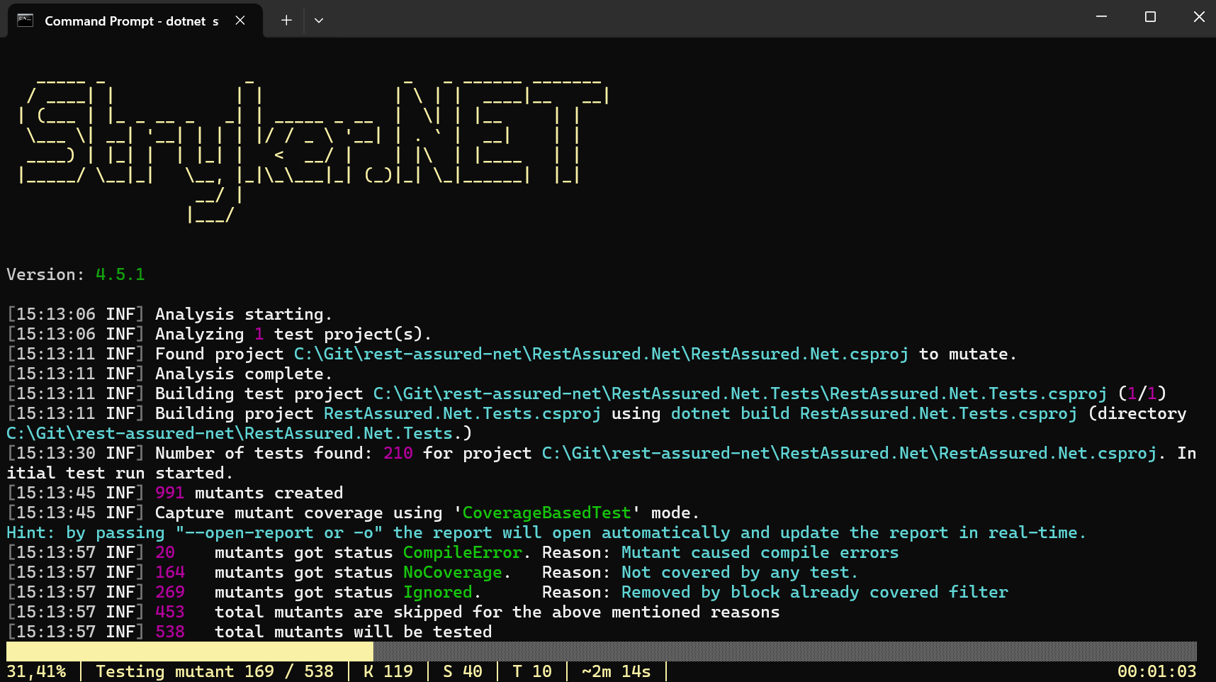 Когда я разрабатываю и выпускаю новые функции или исправления ошибок для RestAssured.Net, я сильно полагаюсь на приёмочные тесты, которые постепенно писал. Помимо того, что они служат живой документацией для библиотеки, я запускаю эти тесты как локально, так и при каждом пуше на GitHub для разных версий .NET, чтобы убедиться, что ничего по случайности не сломал. Но насколько на самом деле надёжны эти тесты? Могу ли я верить, что они будут проходить успешно и падать именно тогда, когда нужно? Покрыл ли я все важные моменты? Я регулярно говорю и пишу об этом, а также обучаю важности тестирования своих тестов, поэтому логично начать применять это на практике и получить больше понимания о качестве набора тестов RestAssured.Net. Один из подходов к изучению качества тестов — это техника, называемая мутационным тестированием. Когда я говорю о тестировании тестов, я демонстрирую это с применением мутационного тестирования (недавнюю лекцию можно посмотреть здесь), но до сих пор я в основном использовал PITest для Java. Поскольку RestAssured.Net — библиотека на C#, я не могу использовать PITest, но слышал много хорошего о Stryker.NET – это был идеальный шанс наконец испробовать его в деле. Добавление Stryker.NET в проект RestAssured.Net Первым шагом было добавление Stryker.Net в проект RestAssured.Net. Stryker.NET — это инструмент для dotnet, поэтому установка проходит просто: выполните команду dotnet new tool-manifest чтобы создать новый манифест инструментов, специфичный для проекта (это был первый локальный dotnet tool для этого проекта), а затем dotnet tool install dotnet-stryker чтобы добавить Stryker.NET в проект как dotnet tool. Первый запуск мутационных тестовЗапуск мутационных тестов с помощью Stryker.NET также прост: dotnet stryker --project RestAssured.Net.csproj из папки с проектом тестов — этого достаточно.