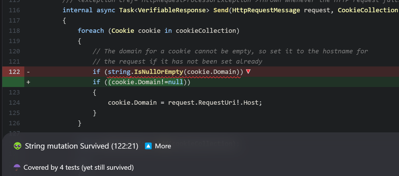 Чтобы понять, что здесь происходит, полезно знать, что в C# у Cookie есть конструктор, который создаёт Cookie, указывая только имя и значение, но при этом cookie должен иметь установленное значение домена. Чтобы это обеспечить, я добавил логику, которую вы видите на скриншоте. Однако Stryker.NET сообщает, что я не тестирую эту логику должным образом, потому что изменение её реализации не вызывает провалов тестов. Возможно, я мог бы протестировать эту конкретную логику с помощью нескольких дополнительных приёмочных тестов, но это действительно лишь небольшой кусок логики, и я должен иметь возможность протестировать его изолированно, верно? Ну, не с кодом, написанным так, как сейчас… Итак, пора вынести этот кусок логики в отдельный класс, что как улучшит модульность кода, так и позволит тестировать его изолированно. Сначала вынесем логику в класс CookieUtils: internal class CookieUtils Я сознательно сделала этот класс внутренним, чтобы он не был напрямую доступен пользователям RestAssured.Net. Однако, поскольку мне нужно обращаться к нему в тестах, я добавил этот небольшой фрагмент в файл RestAssured.Net.csproj: <ItemGroup> Теперь я могу добавить юнит-тесты, которые должны покрывать оба пути в логике SetDomainFor(): [Test] [Test] Эти изменения были добавлены в исходный код и тесты RestAssured.Net в этом коммите. Интересная мутацияДо этого момента все предупреждения, появившиеся в отчёте мутационного тестирования Stryker.NET, были ценными: они указывали на код, который ещё не покрыт тестами, на тесты, которые можно улучшить, и вели к рефакторингу кода для улучшения тестируемости. Использование Stryker.NET (и мутационного тестирования в целом) иногда приводит к довольно, кхм, любопытным мутациям – например, такой: