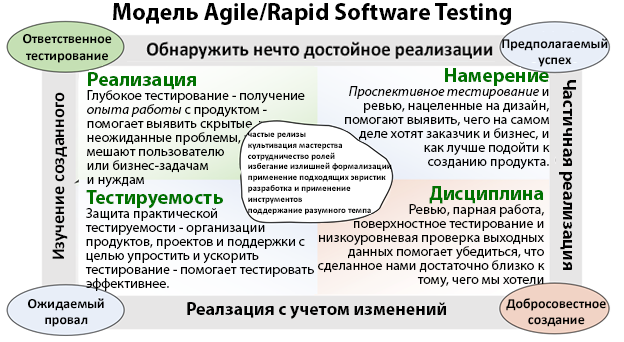 Реализация — это тестирование, расположенное ближе к концу жизненного цикла продукта. Мы подчеркиваем, что идея «сдвига влево» (shift left) — отличная практика, поскольку она поддерживает и ускоряет тестирование именно в рамках Реализации. Однако «сдвиг влево» не может заменить тестирование фрейма Реализации, потому что до этого этапа успехи «сдвига влево» и отсутствие проблем в продукте — лишь надежды и предположения, а не факты. В некоторых случаях тестирование, проведённое до этапа Реализации, может быть достаточным, и для ряда рисков может не понадобиться глубокое тестирование. В целом, особенно во фрейме Реализации, наша задача — сделать тестирование ответственным и достаточно глубоким — достаточно тщательным, чтобы находить скрытые и важные проблемы, но не чрезмерно глубоким. Можно сказать, что цель тут — по крайней мере, для Rapid Software Testing — сделать поверхностное тестирование глубже, а глубокое — дешевле. Кто выполняет тестирование во фрейме Реализации? В методологии Rapid Software Testing выделяют роль ответственного тестировщика — человека, который «несёт личную ответственность за тестирование конкретного объекта определённым способом в конкретном проекте». Когда в команде есть специализированные тестировщики, они, скорее всего, и отвечают за тестирование в рамках Реализации. Если таких людей нет, то существует риск, что тестирование в этом фрейме выполняется лишь частично и по совместительству поддерживающими тестировщиками — или вообще не выполняется. Всё, что было изложено в этой серии, сводится к набору эвристик для тестирования на стыке Agile-разработки и методологии Rapid Software Testing.