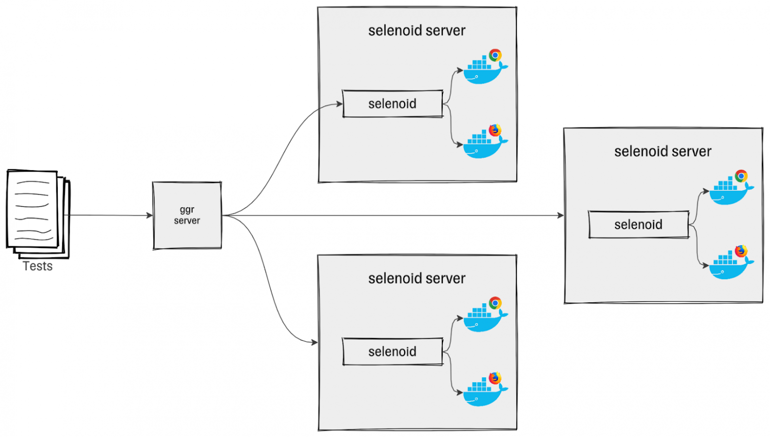 Docker to the rescue. Совместив перечень недостатков со списком хайповых в 2017 году технологий, появилась идея запускать браузеры в Docker-контейнерах из готовых имиджей. Это поможет решить проблемы с повторяемостью тестов и доставкой браузера и драйвера новой версии: просто используем одни и те же имиджи для запуска тестов локально и в CI! Нужно написать какой-нибудь оркестратор. Так в свое время появился проект selenoid, который принимает подключение по протоколу Webdriver и запускает Docker-контейнеры, внутри которых уже все есть: и драйвер, и браузер нужных версий. Вот только мы все еще ограничены одним хостом, на котором запущен selenoid и Docker-демон. Каждому браузеру нужно выделить примерно 1 ядро CPU и 2 ГБ RAM, что ограничивает нас запуском одновременно 64 браузеров на 64-ядерной машине (а такую еще добыть нужно). Увы, этого может быть недостаточно. Что, если у нас есть пара десятков дешевых 8-ядерных виртуалок — как распределять контейнеры с браузерами между ними? Для решения этой задачи авторы проекта selenoid создали балансер ggr, который распределяет запросы между selenoid-хостами — получается браузерная ферма.