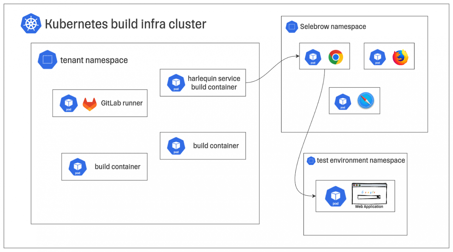 Старая инфраструктура CI не позволяла нам масштабироваться и эффективно утилизировать выделенное железо: есть часы пониженной нагрузки, когда простаивали тысячи ядер CPU. А при чем тут браузерная ферма? Да вроде была ни при чем, но через некоторое время пользователи В новой инфраструктуре сборки мы дали пользователям инструмент для запуска временных изолированных интеграционных окружений прямо внутри CI. Проект называется Kuber-API. Так как CI-кластеры не содержат ingress-контроллеров, попасть на поды, запущенные внутри CI, из старой браузерной фермы не представлялось возможным. Рассмотрев разные возможности — туннели и прочие решения, усложняющие схему взаимодействия, — мы решили... избавиться от фермы совсем. Новая идея состояла в том, чтобы каждой CI-джобе дать свою мини-ферму. Эта мини-ферма будет работать в том же кластере Kubernetes, запускать браузеры внутри k8s-подов вместо Docker-контейнеров и умирать после завершения сборки. Для реализации нового плана за пару недель и почти без перекуров мы написали проект, который назвали Selebrow. Получился GitLab-сервис, который можно подключить в своем CI. Тесты подключаются к localhost:4444, как будто у нас запущен обычный selenoid. Новым подходом мы решили ряд вопросов: