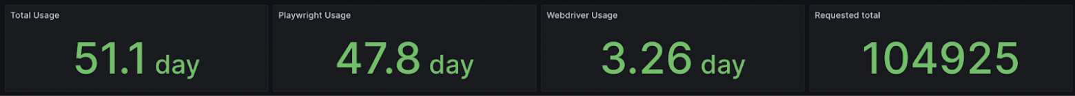 Мы решили написать замену selenoid и в уже существующий сервис добавили поддержку Docker-бэкенда. Конфигурацию браузеров в CI опубликовали на внутреннем общем ресурсе, и теперь она автоматически применяется при запуске бинарника браузерной фермы локально. Замена почившего selenoid может быть потенциально интересна более широкой аудитории, поэтому мы открыли большую часть кода нашего сервиса. Получившийся проект назвали Selebrow. Сейчас наш внутренний проект на 99% собирается из кода Selebrow и мы планируем публиковать все доработки в open source. ИтогиПараллельно с развитием проекта росло количество клиентов-пользователей, и общее количество ежедневно запускаемых браузеров достигло тех самых 100k+, обещанных в заголовке.