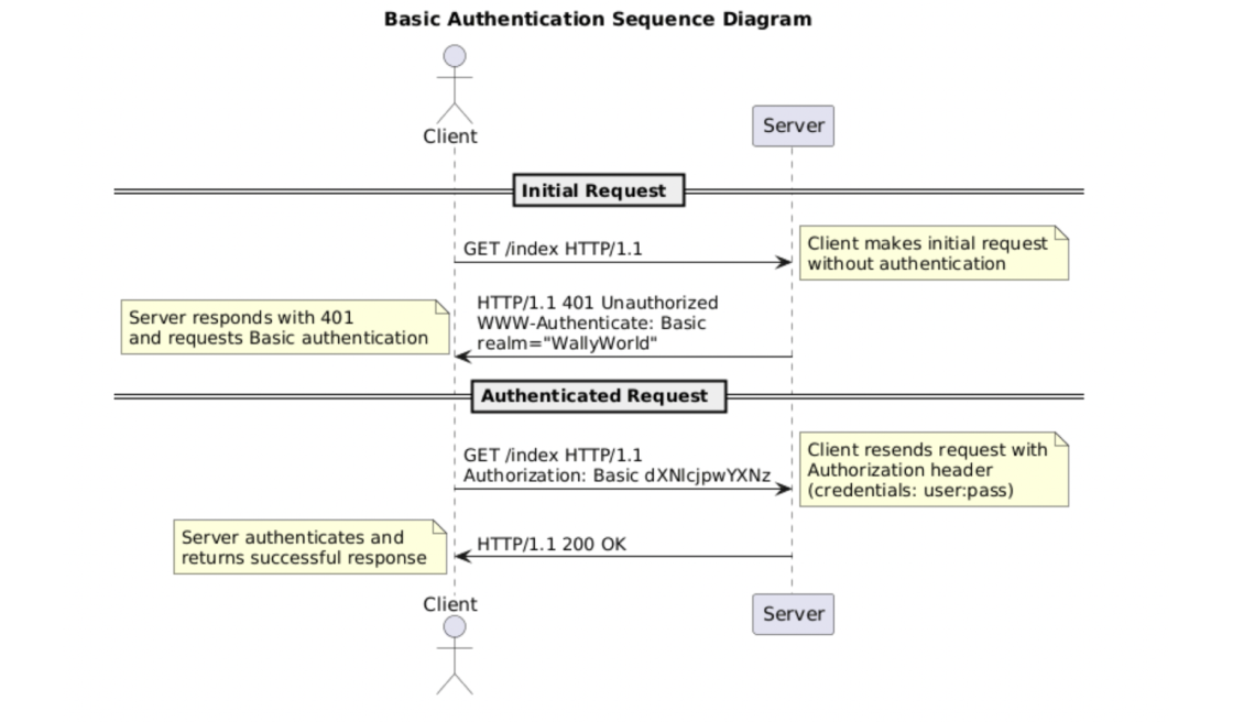 BasicBasic — это простейший способ передачи учетных данных, при котором логин и пароль пользователя объединяются в одну строку, кодируются в формат base64 и отправляются в заголовке HTTP-запроса. Поскольку данные не шифруются, в чистом HTTP этот метод крайне небезопасен и позволяет легко перехватить пароль. Однако при использовании защищенного протокола HTTPS, который обеспечивает сквозное шифрование всего соединения, передача становится безопасной, так как данные передаются внутри зашифрованного канала. Алгоритм: