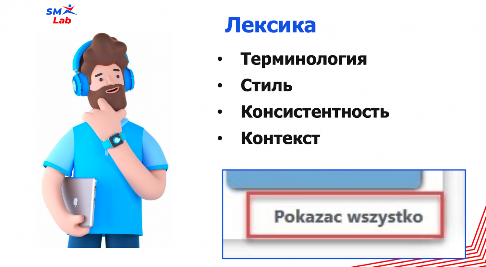 Есть множество моментов, связанных с лексикой. С терминологией всё понятно в целом — нужно проверить, что термины из продуктового глоссария у нас используются корректно, и что они вообще в целом употребляются. Ибо бывает всякое. Само собой, нужно отслеживать стиль, консистентность перевода в целом, то есть что один и тот же термин у вас переводится единообразно по всему тексту. Конечно же, очень важно учитывать контекст. Были случаи, когда executioner переводили и как “палач”, и как “исполнитель”. Хочется надеяться, конечно, что всегда имели в виду исполнителя.