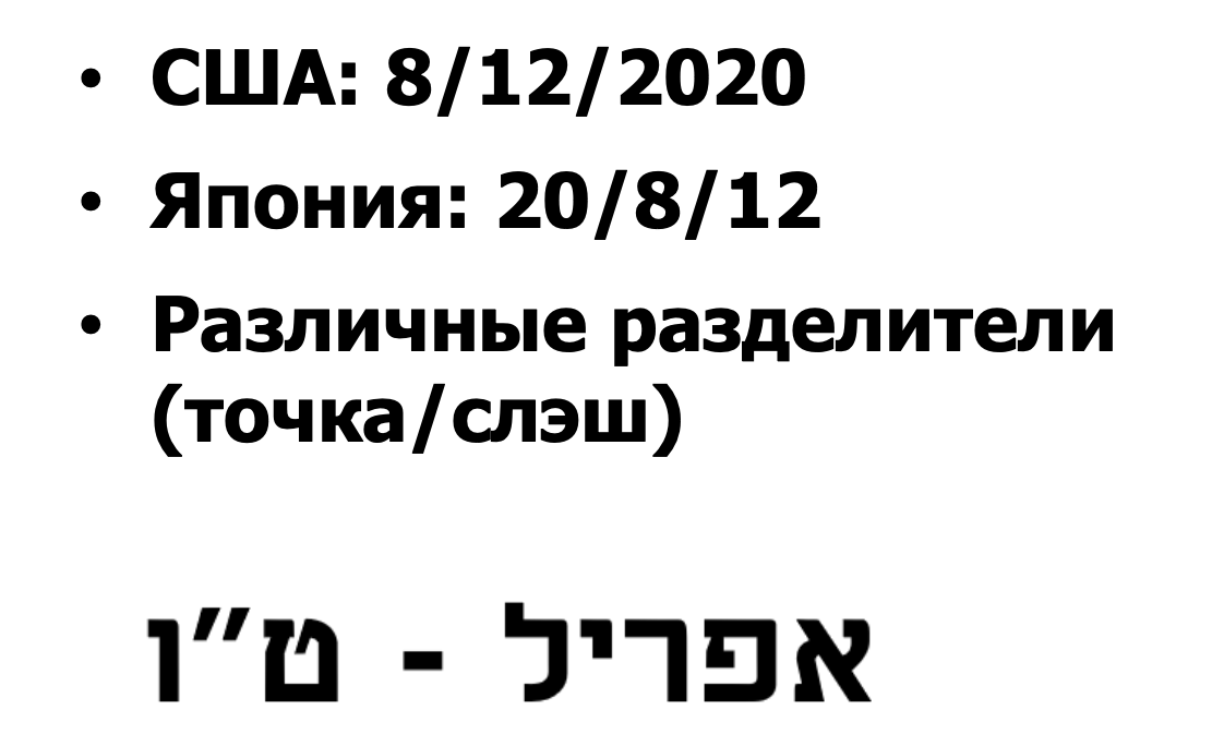 Форматы дат Ни для кого не секрет, что форматы дат в разных странах отличаются в плане написания. Но вот если у вас в продукте поддерживается только один, а вы хотите запускаться в разных странах, это может привести не просто к неудобству, а даже к ошибкам валидации и сбоям в работе приложения. Ведь могут использоваться, например, разные разделители — где-то через точку, где-то через слэш. А ещё в разных странах вполне себе могут записывать различные числа с помощью букв.