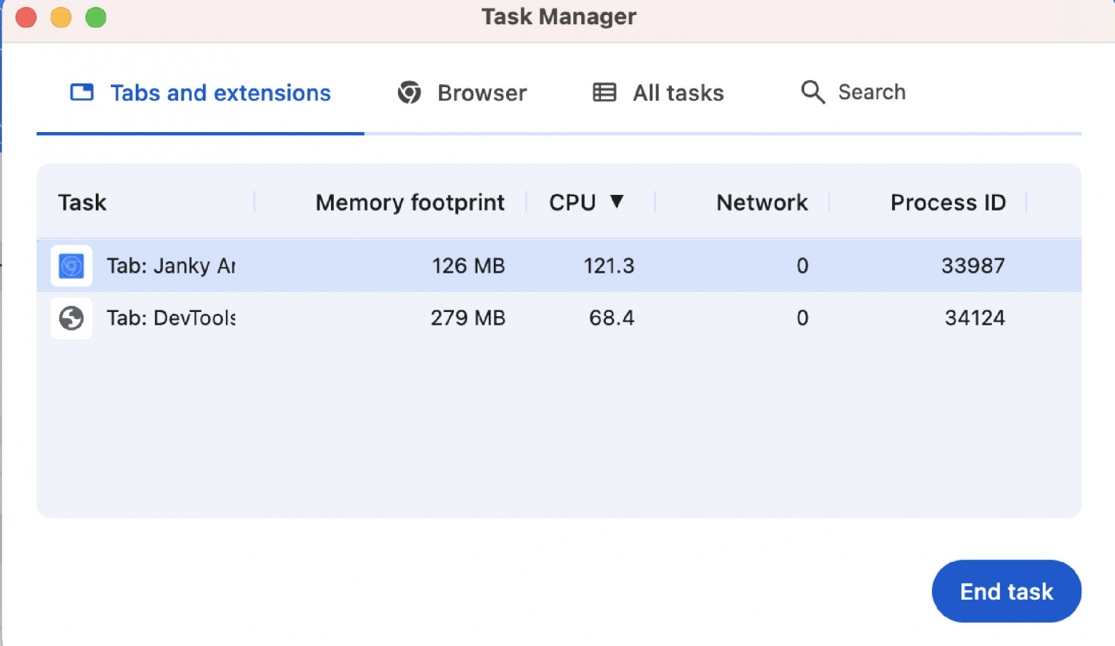Здесь можно посмотреть RAM (колонка memory footprint), нагрузку на процессор, входящий трафик (колонка network — сейчас равен 0 кб/с) и номер процесса. Здесь же можно закрыть любую задачу, выбрав её и кликнув кнопку End task. Прочие вкладки таск-менеджера отображают примерно то же самое, в этом обзоре я хотел продемонстрировать именно метрику потребления нашей вкладкой RAM. Вместо заключенияChrome предоставляет множество инструментов для замера производительности, и в своих статьях я прошёлся лишь по поверхности. Больше и подробнее — в документации по Chrome DevTools. Напишите в комментариях, какие ещё возможности DevTools вам было бы интересно разобрать. Если я работаю с этими инструментами, то продолжу цикл статей. Спасибо за внимание! |