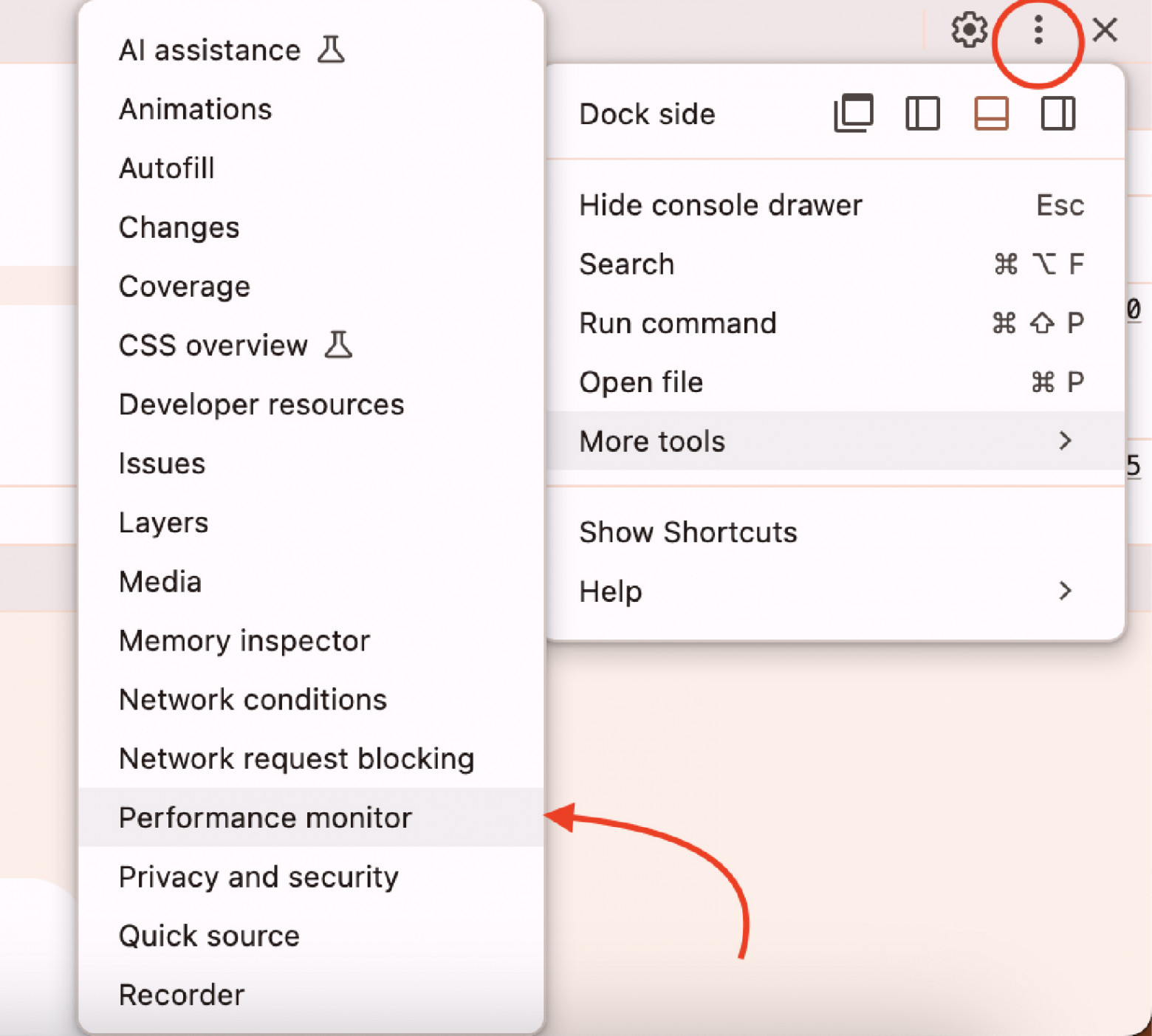 До красной линии я планомерно повышал нагрузку на интерфейс, добавляя летающие квадраты. Примерно на 110 летающих квадратах нагрузка на процессор достигла 100 %, и тогда появились ощутимые просадки производительности. После синей линии я стал убирать квадраты, и производительность резко улучшилась. Frames per second meterОценить FPS (Frames Per Second — кадры в секунду) на глаз сложно. В этом нам поможет ещё один полезный маленький инструмент DevTools под названием FPS meter. Это панель, которая висит поверх окон браузера и отображает текущий FPS. Чтобы добавить её, откроем DevTools, зайдём в расширенные возможности через три вертикальные точки и выберем опцию Run command. К слову, здесь же активируется возможность подмены трафика в DevTools, о которой я писал в своей статье.