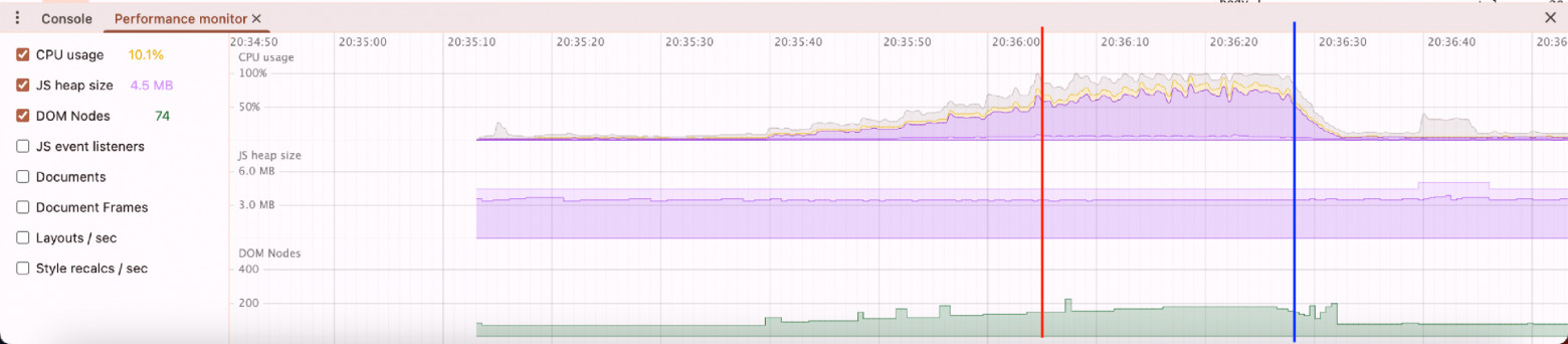 Проведём эксперимент: каждые 3 секунды я буду добавлять на сайт 10 новых кубиков, и мы посмотрим результат в инструменте Performance monitor. Итоговый отчёт на экране.