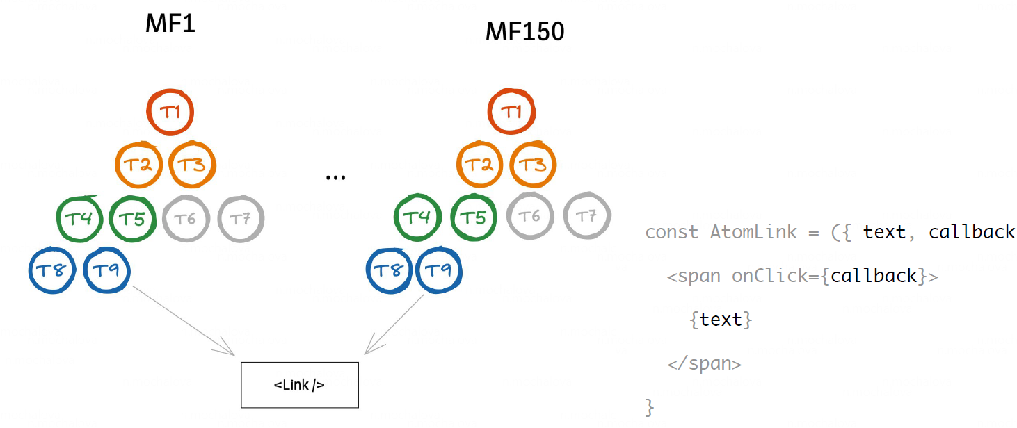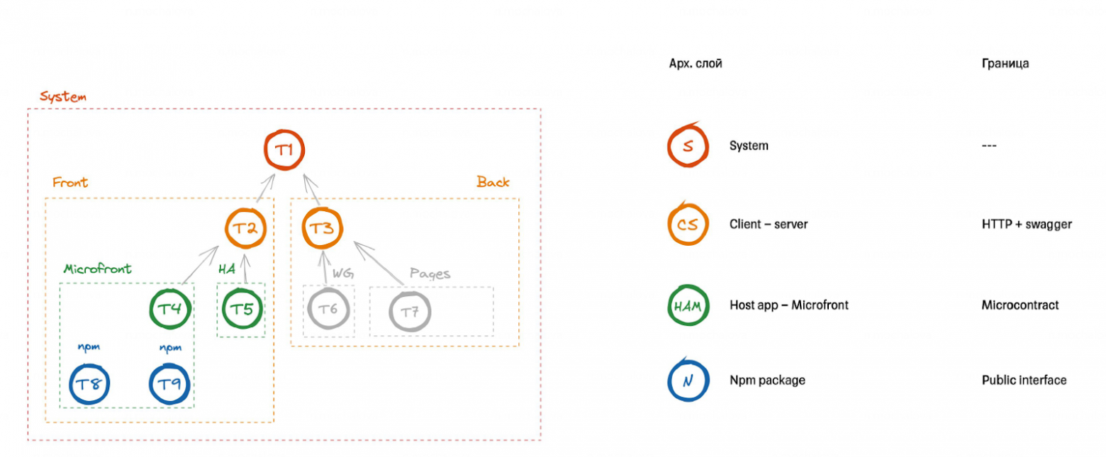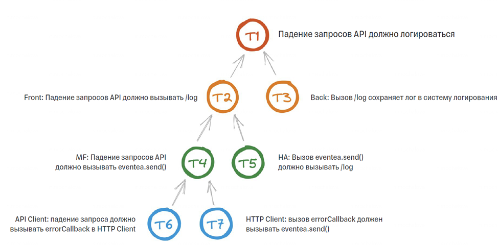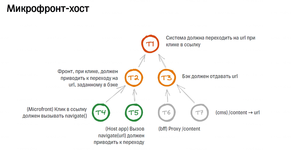 Дальше будем рассматривать только атомарные требования. То есть для 200 микрофронтов по 10 ссылок будет 2000 системных требований. Дальше можно пойти все ниже и ниже, но как понять, до каких пор нужно расщеплять? Можно уйти на 100 шагов вниз, пока не будут получены совсем примитивные элементы, которые раздадим стажерам и сделаем за пять минут. Получаем продукт за пять минут ресурсами стажеров. Но нет, конечно! Вниз можно идти до тех пор, пока есть границы и пока возможно изолированно разрабатывать отдельные элементы системы. А для этого должны быть архитектурные границы, потому что изоляция возможна только благодаря им. Без изоляции нельзя протестировать. Граница между фронтендом и бэкендом — это http-протокол + swagger. Граница между хостовым приложением и микрофронтендом — это microcontract, в данном случае интерфейс на typesript, который определяет их взаимодействие. Микрофронтенд также разделен на два компонента — компонент самого микрофронтенда и компонент ссылки. Граница между ними — public interface. Рассмотрим для примера требование к компоненту Link, которое покажет принадлежность требования к верхнеуровневым системным от разных микрофронтендов. Допустим, дано 150 микрофронтендов (MF1..MF150), в каждом из которых есть ссылка Link. Опытный глаз разработчика сразу заметит, что ссылка одинаковая и можно ее выделить как абстракцию. В результате получаем требование к Link как результат выделения Т9 из разных микрофронтендов. Тогда при спуске уменьшается количество требований. Так спуск позволяет уменьшать количество требований и тестов! 150 требований на уровне микрофронтенда порождают 150 тестов. Но если спуститься по дереву, получится выделить один компонент ссылки, который можно лишь раз разработать и один раз написать для него тест. Требование — информация о том, как должна работать программа. Они формулируются на языке человека, например «Клик по ссылке должен приводить к переходу на url» (атомарные требования). Код — это информация о том, как должна работать программа, на языке компьютера. Лишь код существует объективно! Здесь требование — это первичная информация, а код вторичен. Но трагедия в том, что лишь код существует объективно, а требования часто теряются в рабочих чатах, устаревают, не актуализируются, пребывают в головах, в воздухе и так далее. Приходится делать reverse engeneering, чтобы из кода получить требования обратно. Тест-кейс — это инструкция на человеческом языке для проверки соответствия работы программы поставленному требованию. Например: 1. Кликаем по ссылке. 2. Ожидаем переход. Автотест — это инструкция на языке компьютера для проверки соответствия работы программы поставленному требованию. Например: await page.click('.link') expect(page).toHaveUrl(url) Выводы из примера 1: Требования первичны: