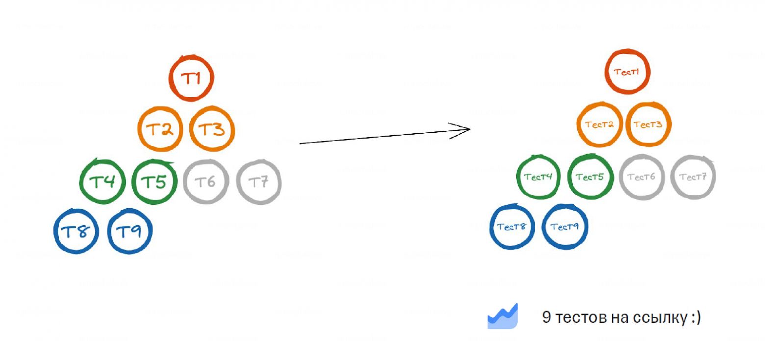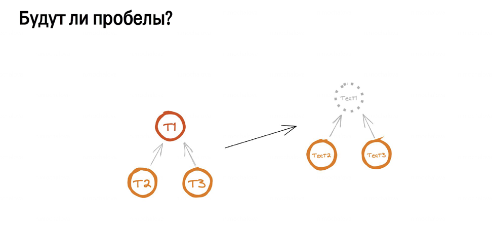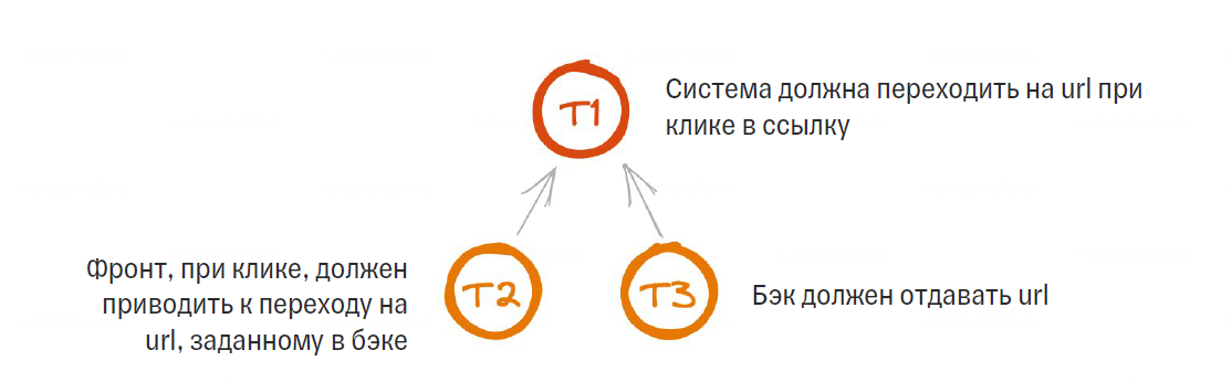 Шаги оказались правильными: проблема действительно была в этом . Но после этого не получалось ответить на вопрос: а каково покрытие всего проекта и есть ли в нем пробелы? То есть поток багов в прод уменьшился, но все равно оставался значительным. Первоначальный анализ показал: причина в том, что, с одной стороны, тесты на проекте выстроены по классической пирамиде тестирования, а с другой — наблюдалось несоответствие имеющихся типов тестов уровням пирамиды. Это приводило к основной проблеме — невозможности оценить тестовое покрытие функционала. И уже с этих позиций было начато исследование, в результате которого обнаружили механизмы появления пробелов. Рассмотрим примеры, которые демонстрируют проблемы в тестовом покрытии. Эти подходы можно применить на любом проекте, чтобы самим попробовать обнаружить такие же. Пример 1. Клик по ссылкеДопустим, имеется функциональное требование: система должна переходить на url при клике на ссылку. Рассмотрим пример расщепления требования, который нам поможет понять все, что будет происходить дальше. Рассматриваемая система не черный ящик, она состоит из элементов — это фронт и бэк. Сама ссылка url задается в бэке и представляет собой некую cms, где можно поменять ссылку на другую. Тогда пользователи безрелизно начнут ходить в другие места. В примере показано системное требование и два элемента системы. Расщепляем требование на эти элементы, как бы проецируем, и получаем два производных требования: Т2 и Т3. Т2 — это требование к фронту, которое звучит как «при клике должен приводить к переходу на url, заданному в бэке». Т3 — это требование к бэку, который должен отдавать url в заданном формате. Исходное требование Т1 осталось, но появились Т2 и Т3 — это производные требования, они зависят от Т1. Если исчезнет Т1, Т2 и Т3 тоже исчезнут. Если Т1 изменится, Т2 и Т3 тоже изменятся. То есть эти три требования существуют совместно. Они различаются: два из них — производные первого. Тут не придуманы новые требования, имеется одно продуктовое системное, которое было расщеплено на два. Итого: