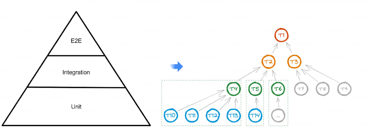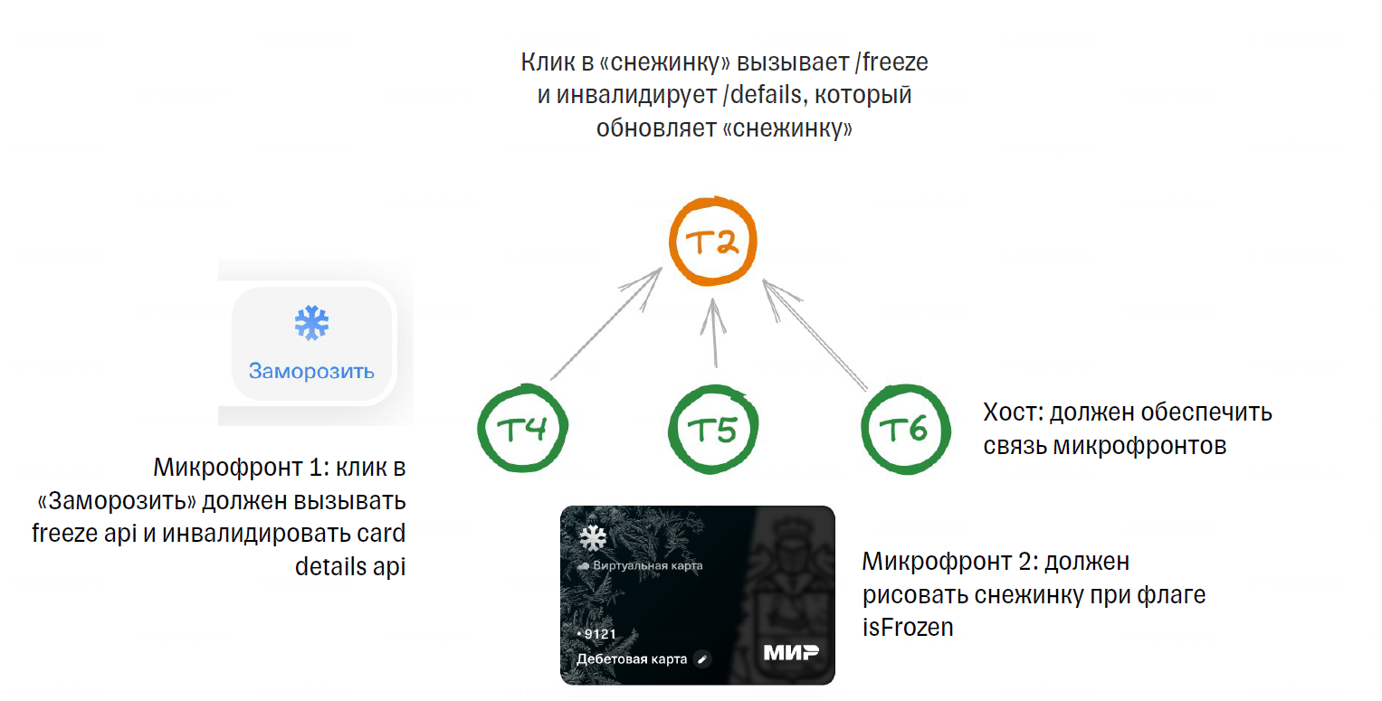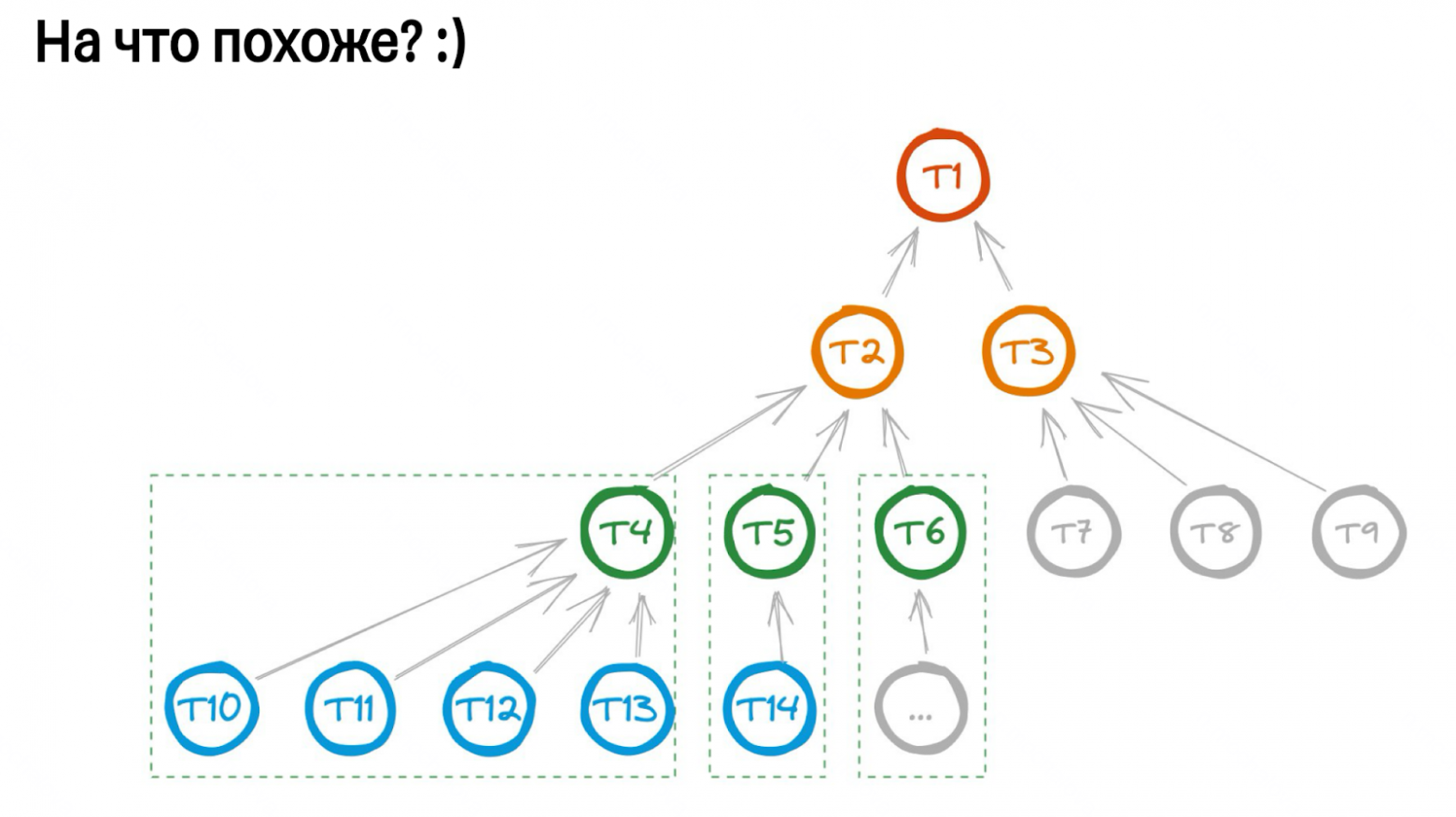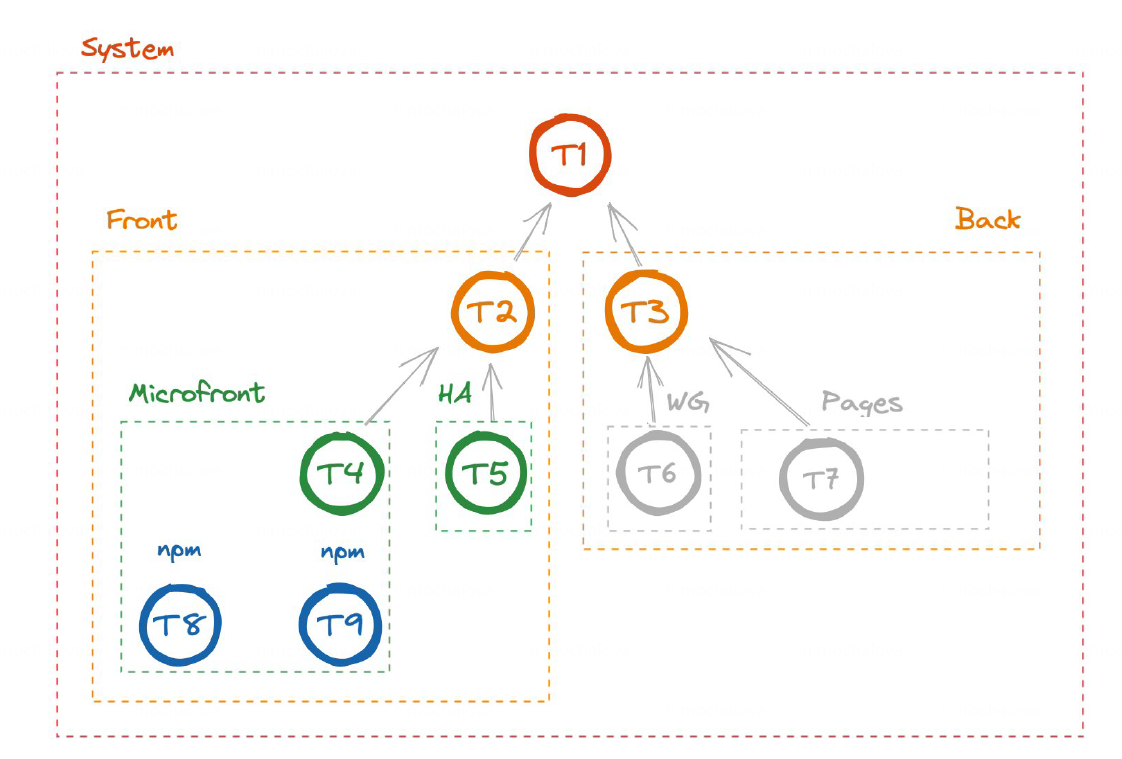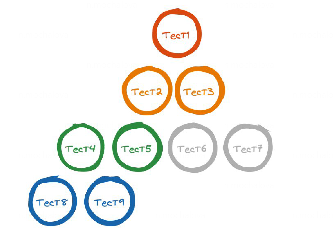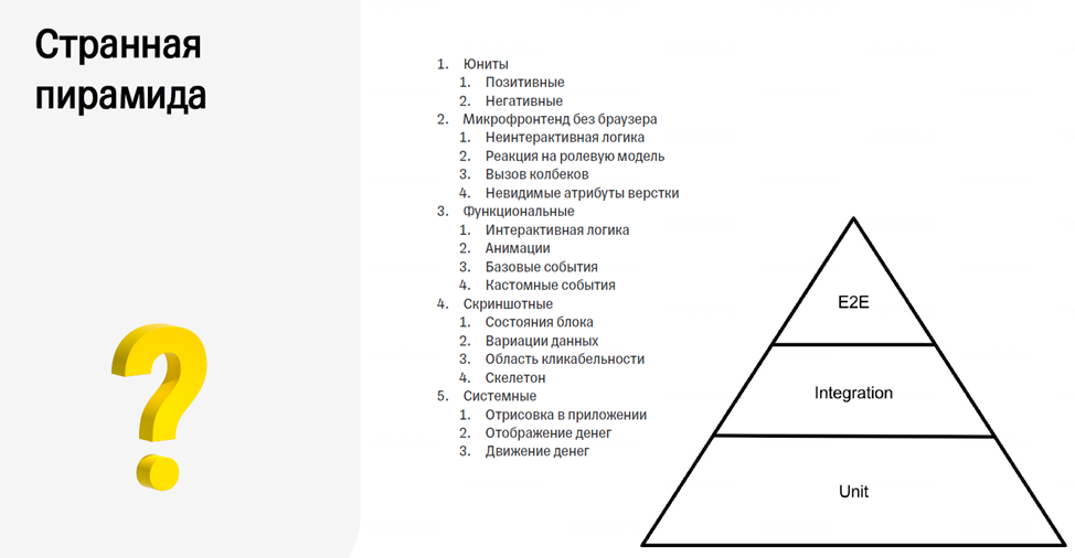 Список можно продолжать, увеличивая тем самым зону известности пробела. Но правая часть неизвестности пробела все же останется, и размер ее нам будет неизвестен. Спуск по пирамиде — источник пробелов. Спуск по пирамиде — это поиск баланса между скоростью, локальностью, временем регресса и тестовым покрытием. Другими словами, это выбор между полным тестовым покрытием с очень большим количеством тестов и частичным покрытием, но с наличием пробелов. Возьмите unit-тест на проекте. Выведите одно или несколько требований, которые он покрывает. Найдите предков этого требования до системного уровня. Попробуйте найти тесты на предков. При этом попытайтесь ответить на вопросы: к чему относится unit-тест; полезен ли этот unit-тест; какую часть в вашей архитектуре он закрывает. Задача со звездочкой: сделать то же для случайного места в коде. Пример 2. СнежинкаИмеется требование: лик по кнопке «Заморозить» замораживает карту, и вместо номера счета появляется снежинка. Расщепим системное требование на фронтенд и бэкенд: Фронтенд должен вызывать метод freeze и проверять получение данных карты методом details, а затем обновлять снежинку по флагу «Заморожен». Бэкенд должен замораживать карту. Дальше покупки по ней невозможны Расщепим Т2. Пример со снежинкой сложнее, потому что здесь два микрофронтенда: один — кнопки, второй — сама карта. Требования к первому микрофронтенду — вызов методов freeze и details по клику. Требования ко второму микрофронтенду — реактивное обновление данных. И тут еще появляется хостовое приложение (Т6), которое обеспечивает взаимодействие между двумя микрофронтендами. В итоге получаем три производных требования фронтенда. Можно пойти ниже и расщепить требования Т4, Т5, Т6, но не будем этого делать, так как, поверьте, и там будут конкретные сущности с производными требованиями. Является ли дерево требований пирамидой тестирования? Нет, конечно. Пирамида — это производная архитектуры. Любое разложение на производные возможно благодаря архитектурным границам, помогающим изолировать элементы системы. Как же можно совместить слои пирамиды с деревом требований? Никак :) Почти каждый узел может быть в каждом слое. < Вспомним тот факт, что пирамиду придумали в 1990-х и она хорошо работает с элементами, которые являются элементарными. Представьте, что система разбита на элементы и они дальше не бьются. Вот в этой конфигурации написаны тесты на элементы (юниты, модульные), тесты на интеграцию этих элементов и системные тесты на систему целиком. Когда система сложнее рассмотренной, в ее архитектурной диаграмме узлов гораздо больше. И тогда это дерево неравной высоты, то есть цепочки могут разветвляться на разную длину. Дерево не будет даже сбалансировано, поэтому в общем случае это, конечно, не пирамида. Можно оперировать какими-то другими сущностями (технологиями, целями проверки и прочим), но в основе всего — изоляция, то есть то, как система будет разбита на элементы. Если рассматриваемая система — это монолит, здесь никакой пирамиды не будет. Такую систему можно тестировать только как черный ящик. Если уровней тестов больше двух, применить пирамиду нельзя. Поэтому здесь предлагаю взять любое системное требование и попробовать разложить его по архитектуре, а потом сопоставить получившиеся тесты на узлах с видами тестов на проекте. Тогда мо