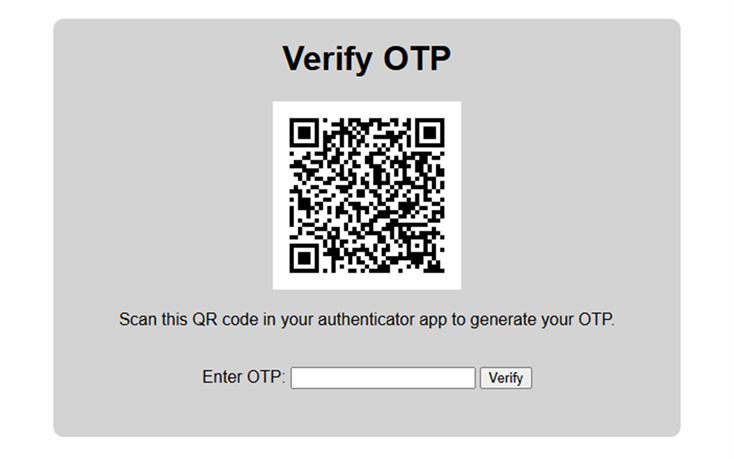 Страница входа тестового приложения После успешного ввода логина и пароля приложение генерирует уникальный QR-код, содержащий TOTP-секрет, который пользователь должен отсканировать для завершения входа. Страница проверки OTP в тестовом приложении Этап двухфакторной аутентификации (2FA), основанный на этом QR-коде, обеспечивает генерацию уникального одноразового кода (OTP) каждые 30 секунд, что значительно повышает безопасность процесса входа.