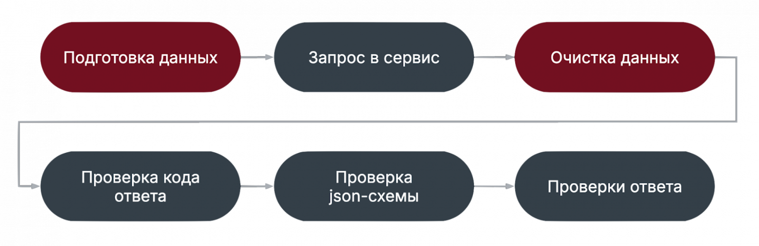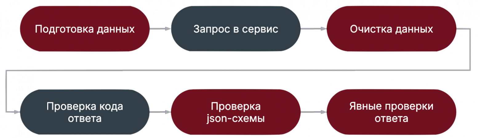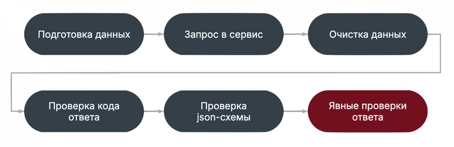 В принципе, эти паттерны могут использоваться и на других этапах теста. Также хочется подсветить, что если в тесте предполагается модифицировать чувствительные данные, которые могут поломать всё окружение, то такой автотест лучше не писать. Проверки ответаТеперь рассмотрим внимательнее проверки ответов.