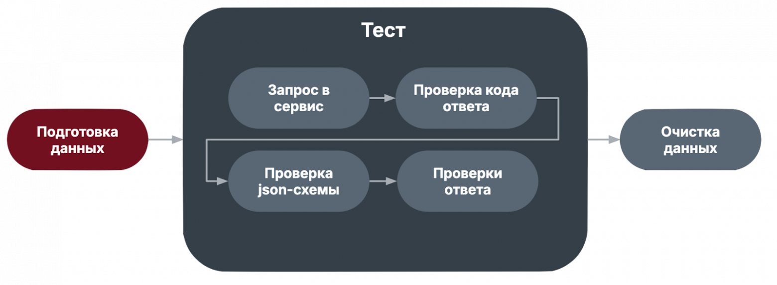 Далее мы подробнее рассмотрим причины непосредственно связанные с автотестами. Места нестабильности автотестовПосле вступления мы можем выделить на схеме основные проблемные места – этапы подготовки и очистки данных, проверка схемы ответа и явные проверки ответа.