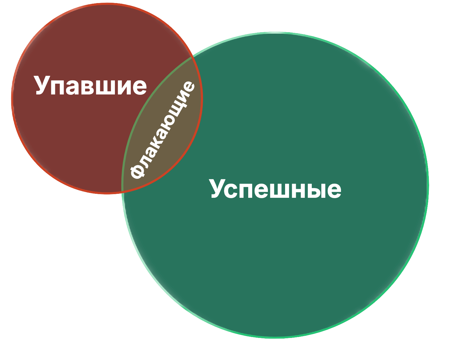 Флакающий тестДля начала давайте разберемся, что такое флакающий тест. Если мы посмотрим на абстрактную тестовую модель в любой момент жизни, то там будут стабильно зеленые тесты (которые каждый раз проходят успешно), стабильно красные тесты (которые каждый раз падают) и те, которые никуда стабильно не попадают - флакающие. Флакающий (нестабильный) тест – это такой тест, который в условно одинаковых обстоятельствах выдает разный результат. Если говорить бытовым языком, то это тот тест, который надо перезапустить 3 раза, чтобы быть уверенным в его результате. Тест может быть нестабильным как из-за плавающего бага, так и из-за того, что в тесте что-то не учтено.