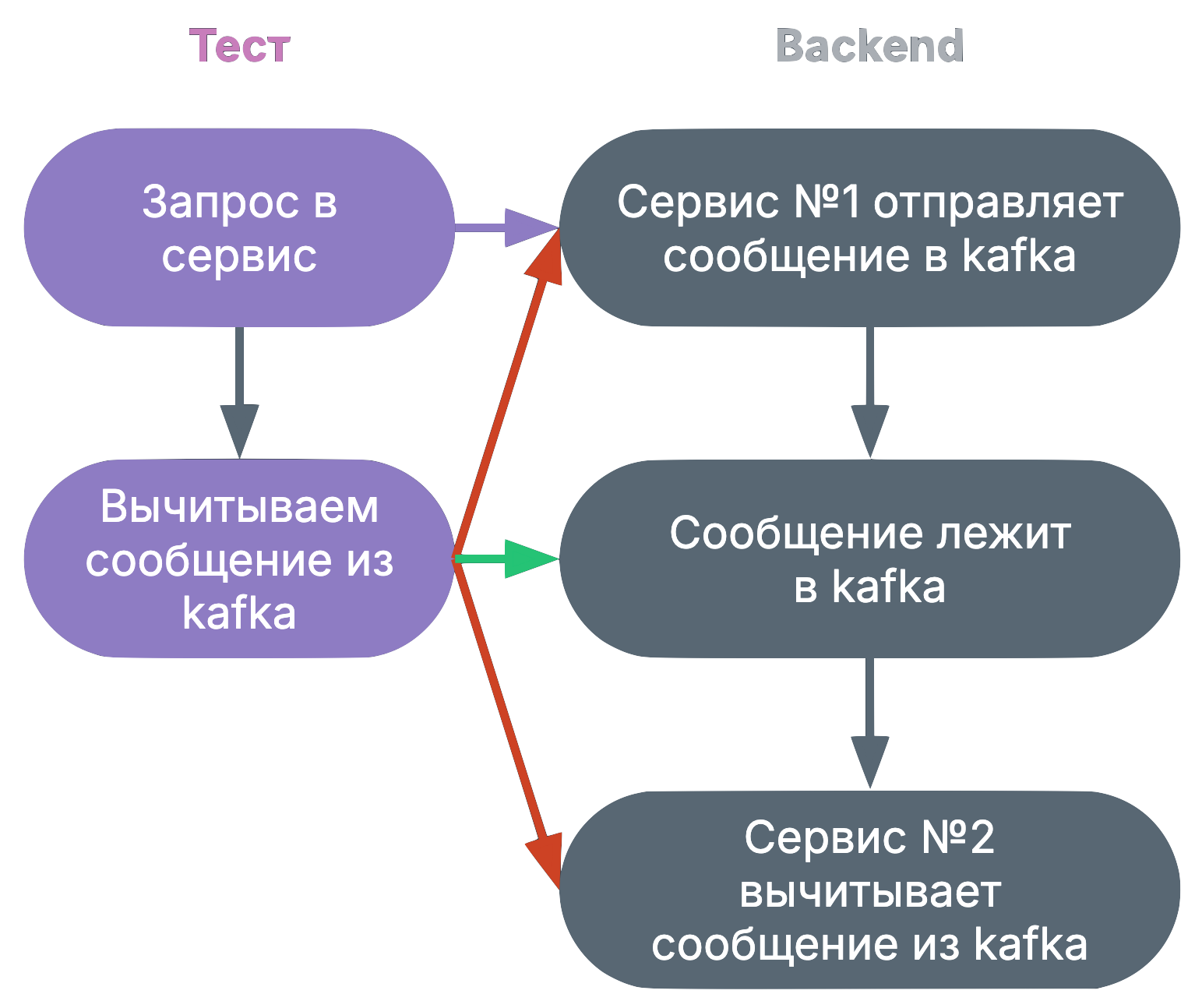 Стоит ли автоматизировать нестабильные сценарииМы с вами разобрались с техниками стабилизации автотестов, но бывают такие сценарии тестов, где результат фактически зависит от скорости, ловкости и острого взгляда QA, и поэтому может быть изначально не очень стабильными. Примером такой ситуации может служить гонка состояний. Наш тест отправляет запрос в сервис и проверяет, что этот сервис отправил сообщение в Kafka. Тест должен проверить наличие сообщения. Проблема в том, что сообщение должно быть вычитано в промежуток времени, после того, как проверяемый сервис его отправил, но до того, как другой сервис его вычитал.