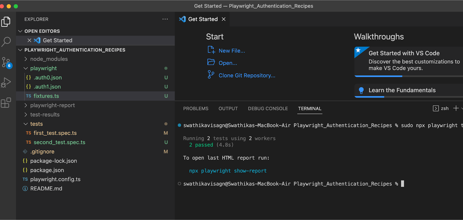 Результат рецепта 2После выполнения тестов создаются файлы состояния хранения auth0.json и auth1.json. Каждый из них будет использоваться своим параллельным воркером. Ниже видно, что оба теста прошли успешно, и каждый процесс воркера использовал уникальное состояние хранения из auth0.json и auth1.json.