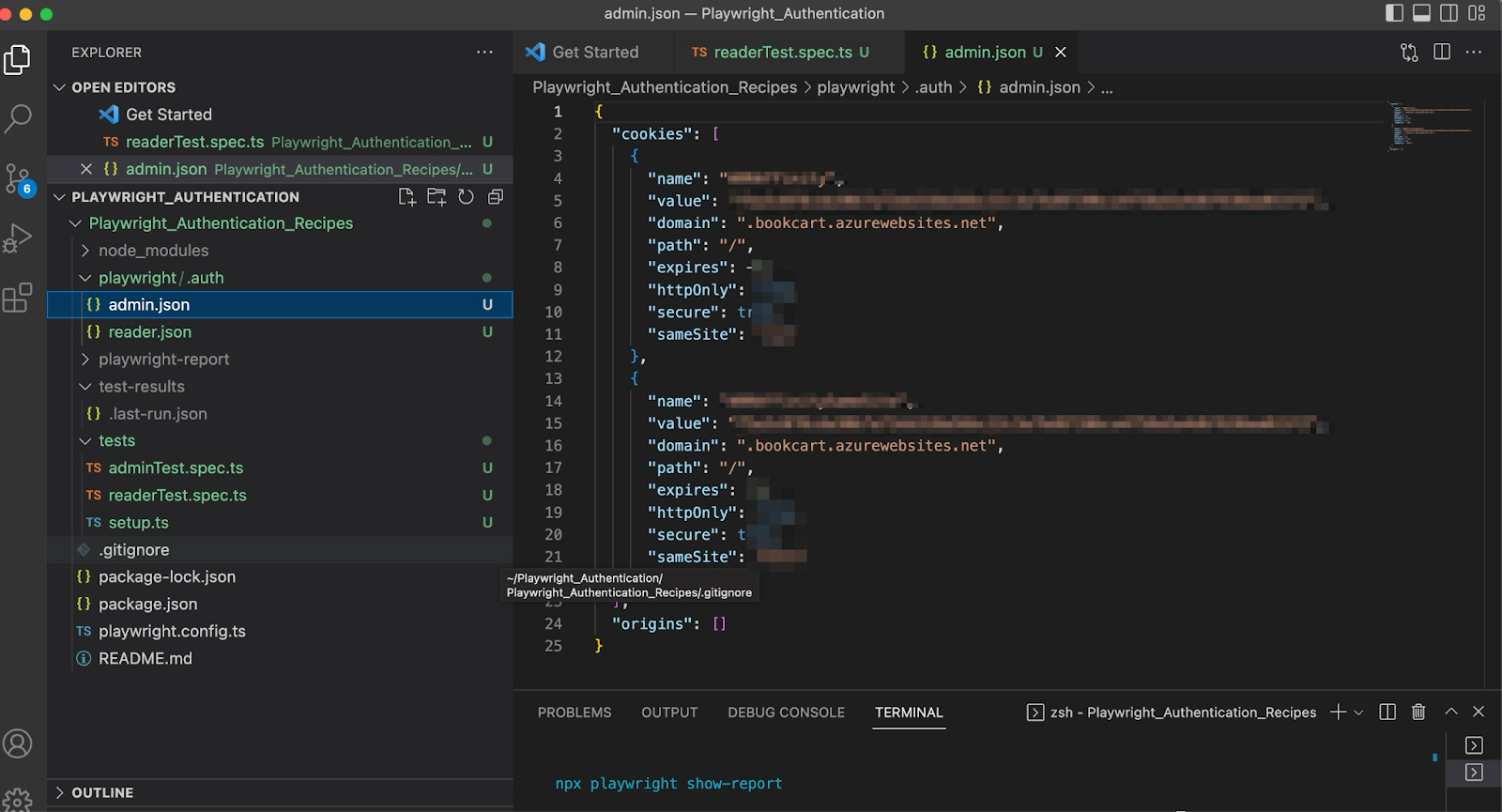 Рецепт 3: Аутентификация через API для нескольких аккаунтов и использование полученных состояний храненияВсе знают, что в тестировании API-эндпойнты быстрее, чем UI. Особенно это актуально при работе с несколькими учетными записями пользователей. Тестирование с учетом ролей критично, когда нужно проверять действия, которые разрешены определенной категории пользователей. Этот рецепт идеально подходит, когда необходимо войти под несколькими пользователями и выполнять действия с разными уровнями авторизации. Для демонстрации представим, что у вас два пользователя: один админ, другой читатель/покупатель. (Сайт Book Cart не поддерживает разные роли, только читателя: мы просто воображаем это.) Посмотрим, как войти как админ и как читатель, чтобы использовать их состояния хранения в тестах. Я опиралась на документацию на сайте Playwright. Рассмотрим реализацию. Шаг 1: создаем setup.spec файлСоздайте файл tests/setup.spec.ts с шагами аутентификации через API для админа и читателя, а также сохранением их состояний хранения в соответствующих json-файлах: admin.json и reader.json. Обязательно добавьте admin.json и reader.json в .gitignore, чтобы случайно не залить их в репозиторий. import { test as setup, expect } from "@playwright/test";