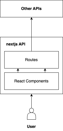 Схема 2: Предлагаемая архитектура NextJS для restful-booker-platform. Пользователь подключается к API на NextJS, который предоставляет React-компоненты и маршруты к другим API. Это упрощает процесс рендеринга UI и доступа к другим API. Учитывая это, вот мои критерии успеха: